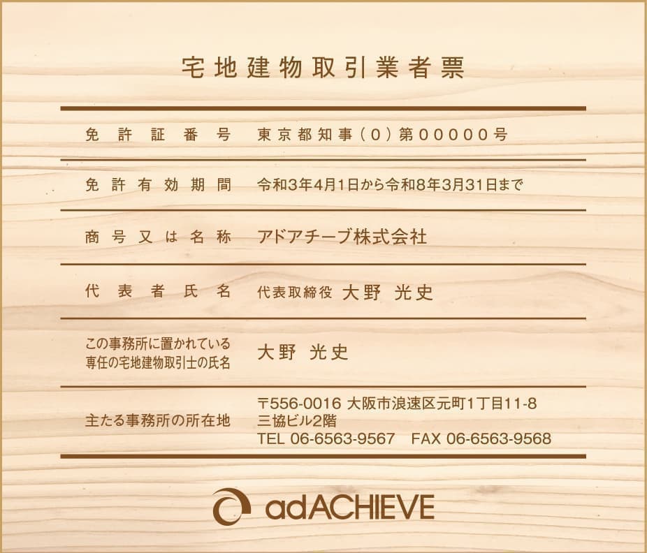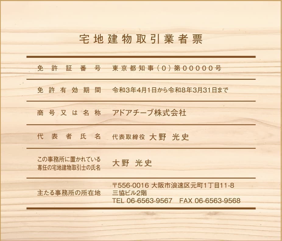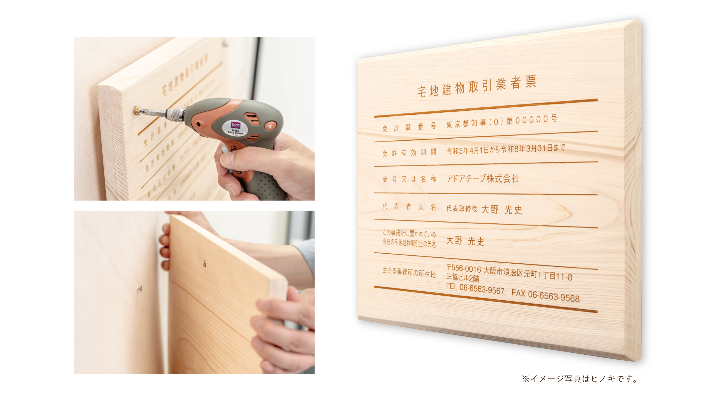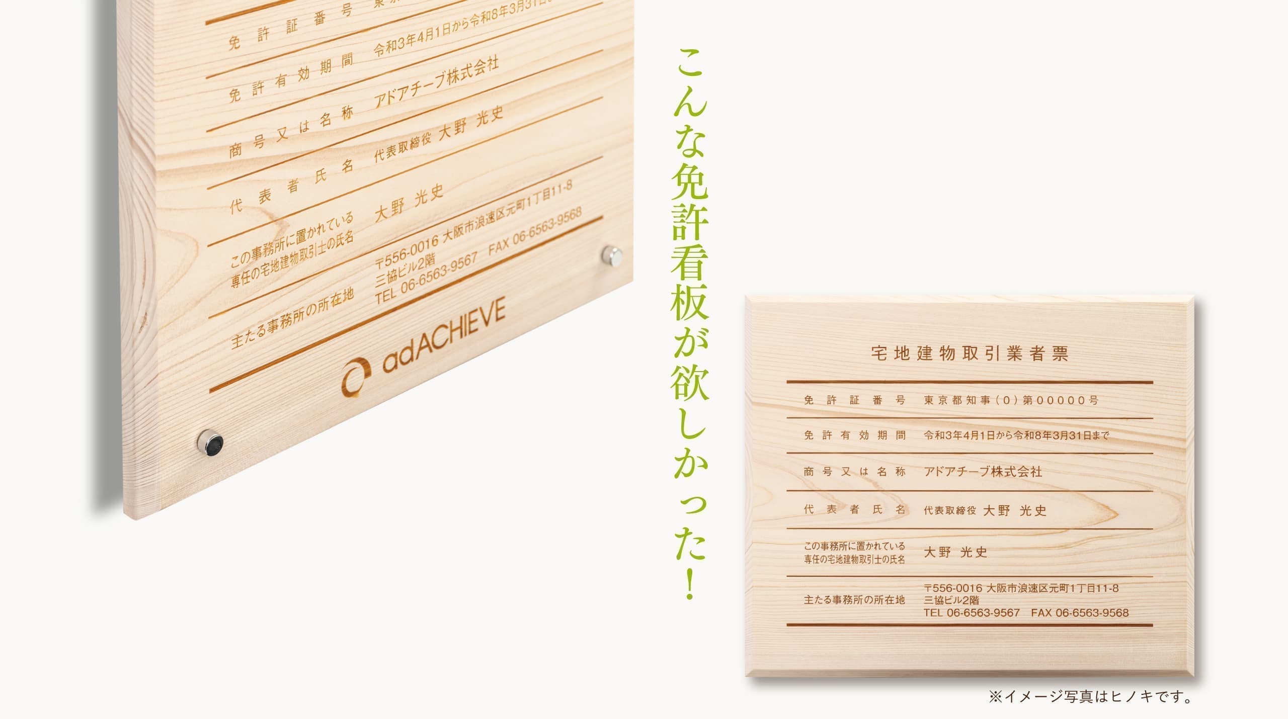 住宅などの建築物は木製の建物がたくさんあるのに、木の看板がないのはなぜ? そんなご要望にお応えして、作ってしまいました!無垢の1枚板で作った宅建業者票は、木の温もりと質感で、一味違ったオシャレな空間をお楽しみいただけます。