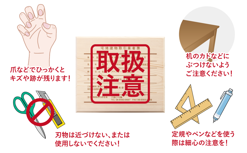 板の表面は、なめらかに仕上げておりますが、デリケートな素材のため、キズ等が入りやすい商品となります。取り付けの際の取り扱いには十分ご注意ください。