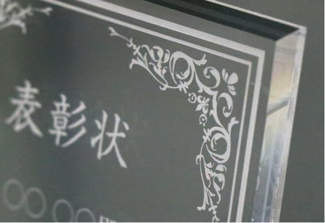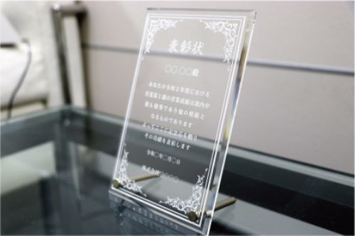 営業成績や社内公募の優秀者に渡す表彰状も、アクリルで作れば高級感のある一枚に。スタンド式の小さなサイズでも存在感は抜群です。通常のカッティングシート・インクジェットシートの仕様に加え、レーザー仕様にも対応をしているので、ワンランク上の上質なデザインで飾ることができます。