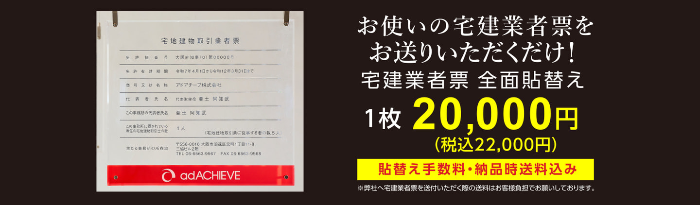 お送りいただきました宅地建物取引業者票を弊社にて貼り替えいたします。作業時間として約1〜2週間の期間をいただきます。